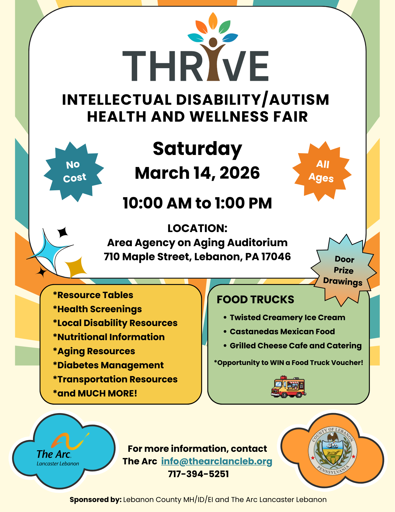 Don’t miss this FREE Intellectual Disability/Autism Health & Wellness Fair in Lebanon County! Join us on Saturday, March 14, 2026 , at the Area Agency on Aging Auditorium, 710 Maple Street, Lebanon, PA 17046, for valuable resources, connections, and support. For more information, contact Amy Austin: amy@thearclancleb.org .
